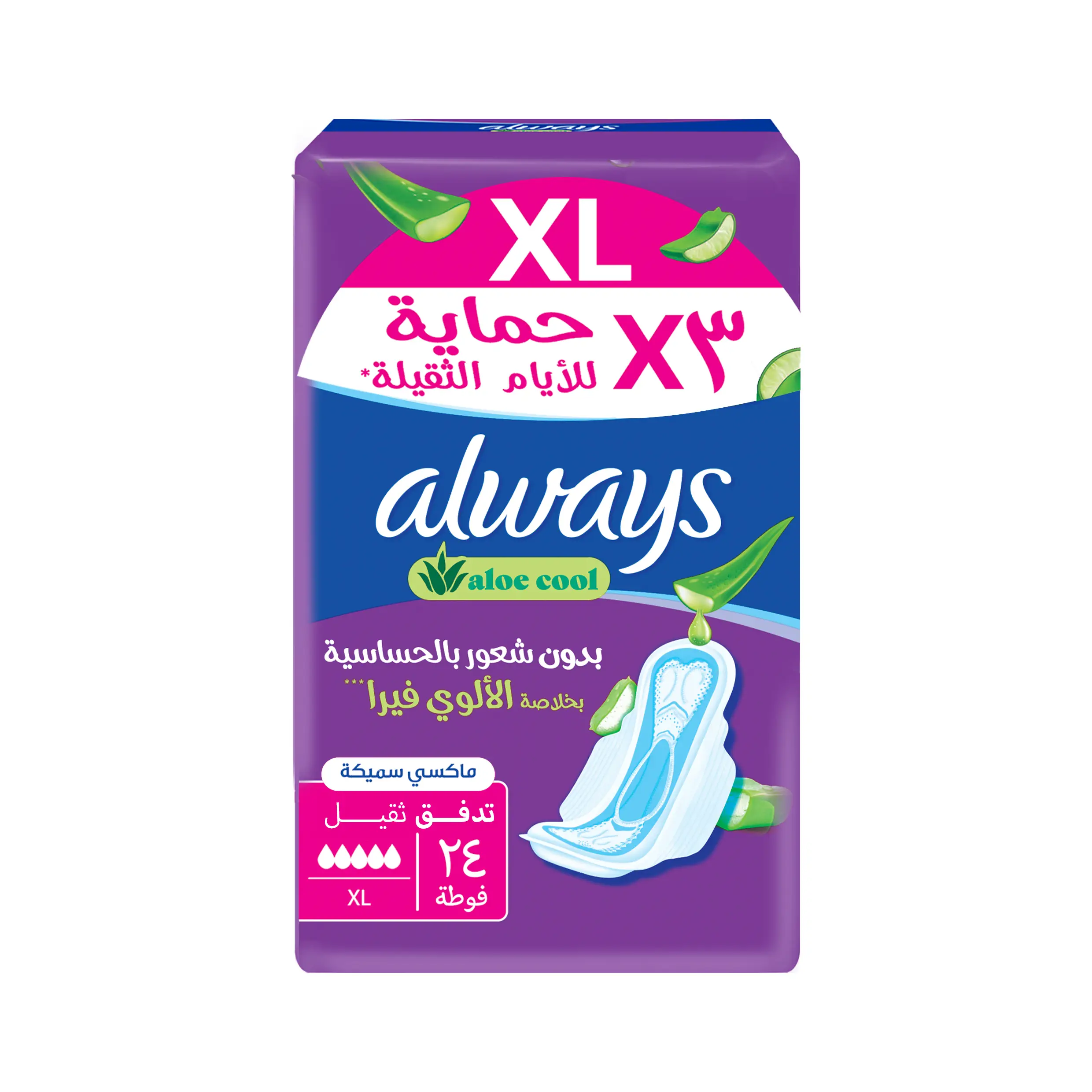 - إن فوط أولويز Aloe Cool بمقاس XL تضمن لكِ صفر شعور بالحساسية وحماية من التسرب حتى ١٠٠٪ لتنعمي بالراحة، والحماية، والانتعاش طوال اليوم.