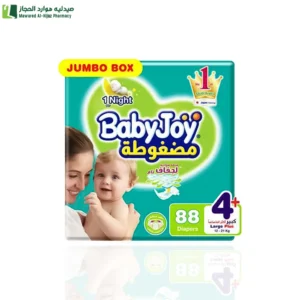 وصف المنتج: حفاضات بيبي جوي رقم 4+ كبير (12-21 kg) صندوق جامبو 88 حفاضة
