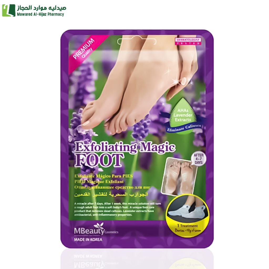جوارب بتركيبة مقشرة، جوارب كبيرة الحجم، مواد صحية، لا تسبب تهيج، أحماض ألفا هيدروكسي وخلاصة نباتية مضافة.