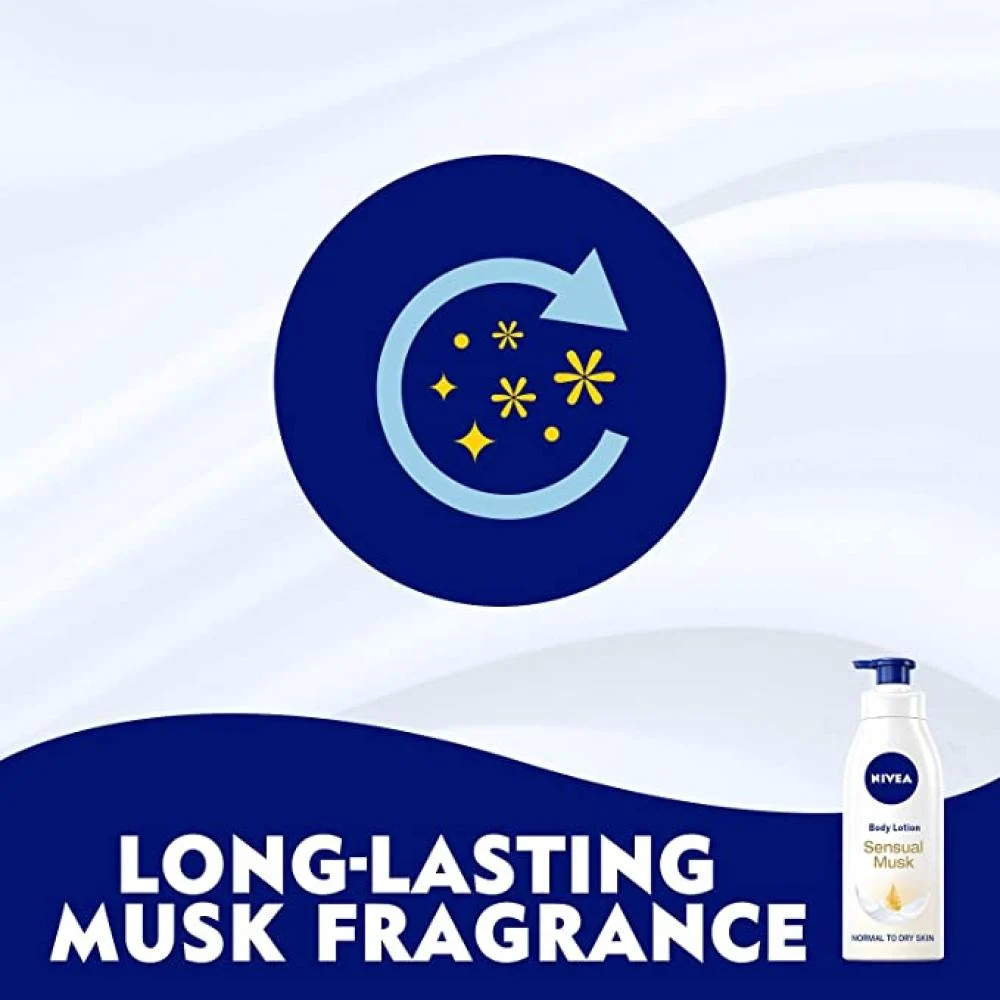 مع لوشن الجسم بالمسك الجذاب من نيفيا ،امنحي بشرتك ترطيبا متقدما مع عبير المسك الكثيف طويل الأمد. عبير المسك الموجود في لوشن للجسم من نيفيا المميز يغمر أحاسيسك بشعور رائع على مدار اليوم.