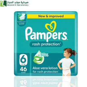 وصف المنتج إن حفاضات بامبرز بيبي دراي أصبحت بامبرز الجديدة والمطورة للحماية من التسلخات. ينتج التسرب عادة عن كون حجم الحفاض غير مناسب، مما يؤدي إلى تهيج البشرة. إن هذه الحفاضات متوفرة بمقاس 6 للحماية الفائقة من التسرب. وهي مزوّدة بـ3 طبقات معززة و+50% كريم صبار أكثر لتهدئة البشرة. تحتوي الحفاضات على حواجز مزدوجة لمنع التسرب ومواد مرنة لضمان ملاءمة أفضل، مما يسمح لطفلك بالحركة بحرية.