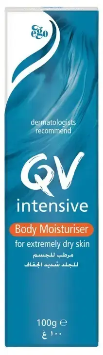 مرطب الجسم QV Intensive Body Moisturizer خالي من الماء لذلك لن يسبب اللسع عند وضعه على الجلد الملتهب أو المتشقق.
