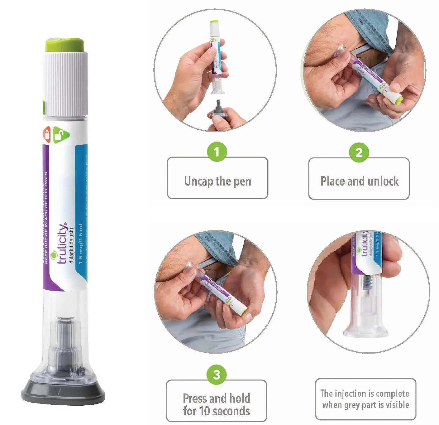 - يحتوي كل قلم على جرعة أسبوعية واحدة من دولاجلوتايد (0.75 مجم ، 1.5 مجم ، 3 مجم أو 4.5 مجم).